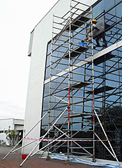 5月17日,在人民路東段路南的一個裝修門面招牌的腳手架上,兩名工人在沒有佩戴安全帽、安全帶,沒有防護網的情況下施工。其中一名工人不...
